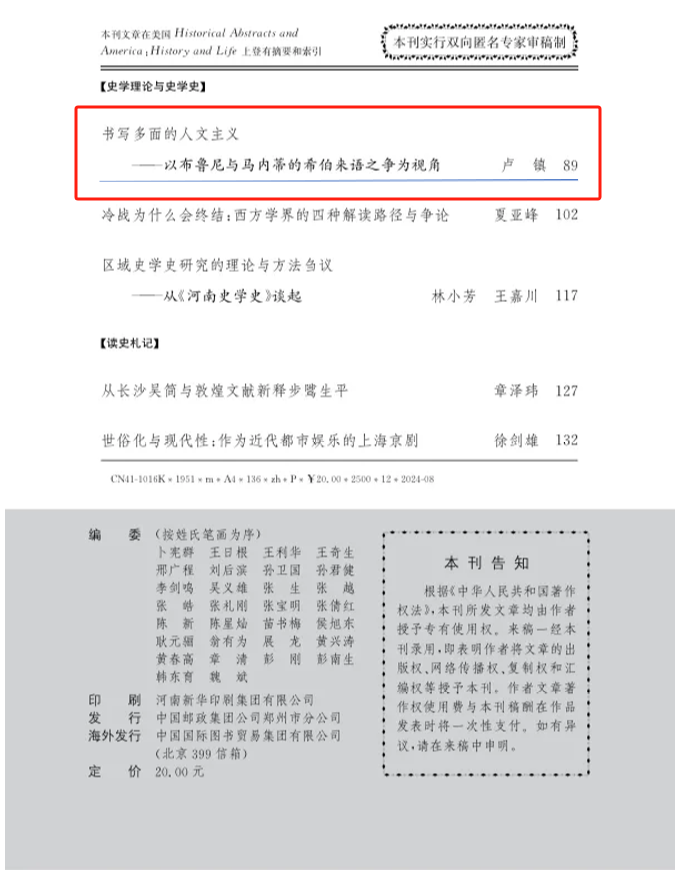 公司世界史学系副研究员卢镇撰写的《书写多面的人文主义——以布鲁尼与马内蒂的希伯来语之争为视角》一文在《史学月刊》2024年第8期正式发表。