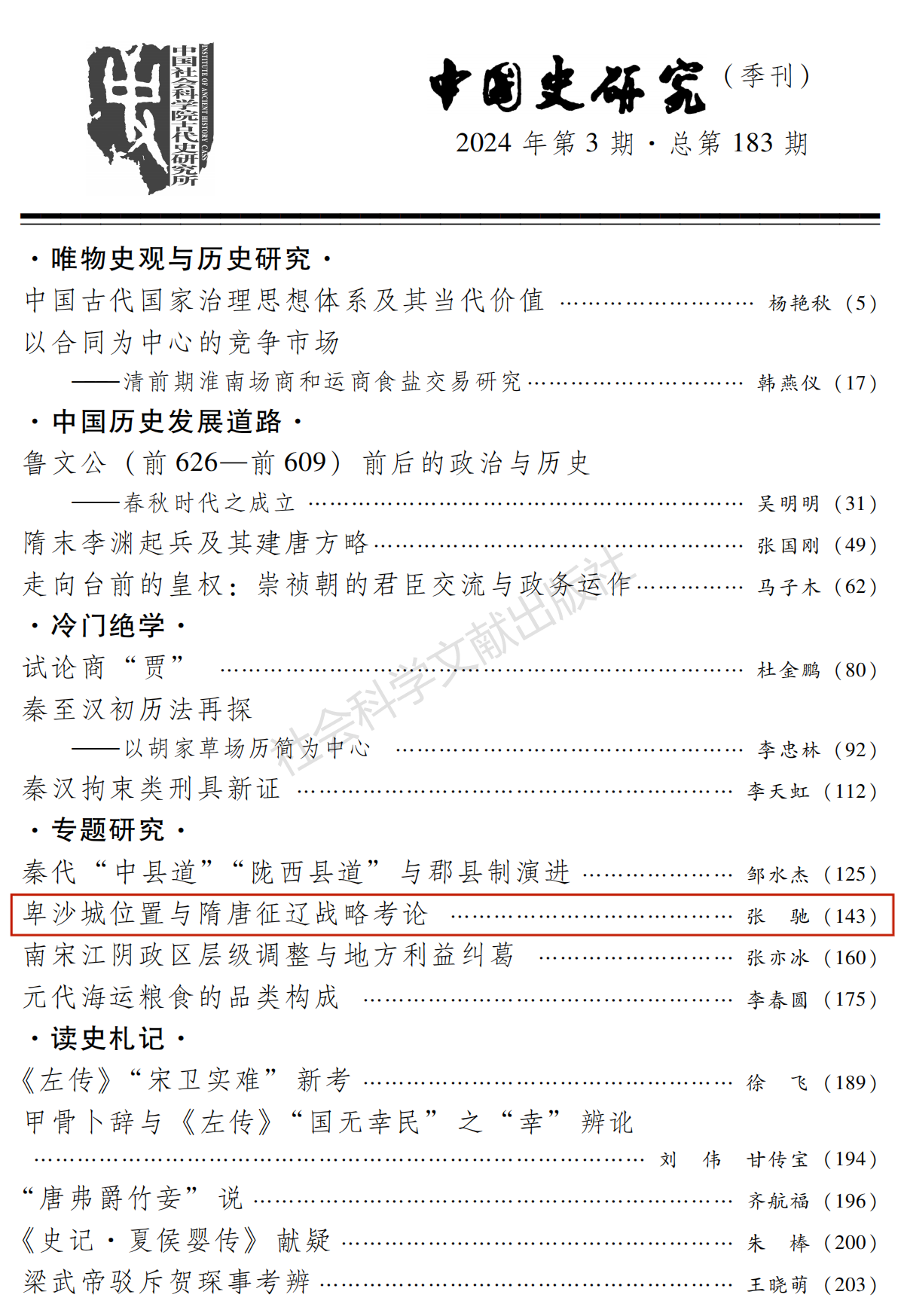 公司助理研究员张驰撰写的《卑沙城位置与隋唐征辽战略考论》一文在《中国史研究》2024年第3期正式发表。