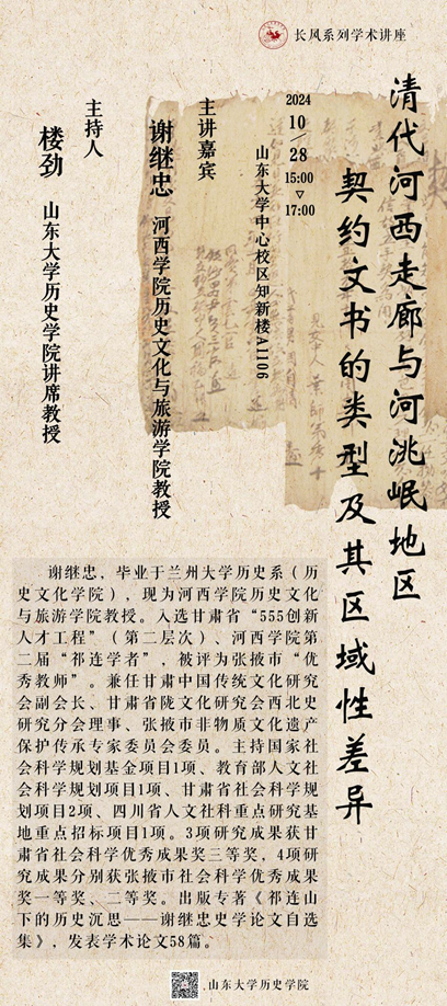 10月28日,河西公司历史文化与旅游公司谢继忠教授做客sunbet,为公司师生带来题为“清代河西走廊与河洮岷地区契约文书的类型及其区域性差异”的专题学术讲座。讲座由sunbet讲席教授楼劲主持。