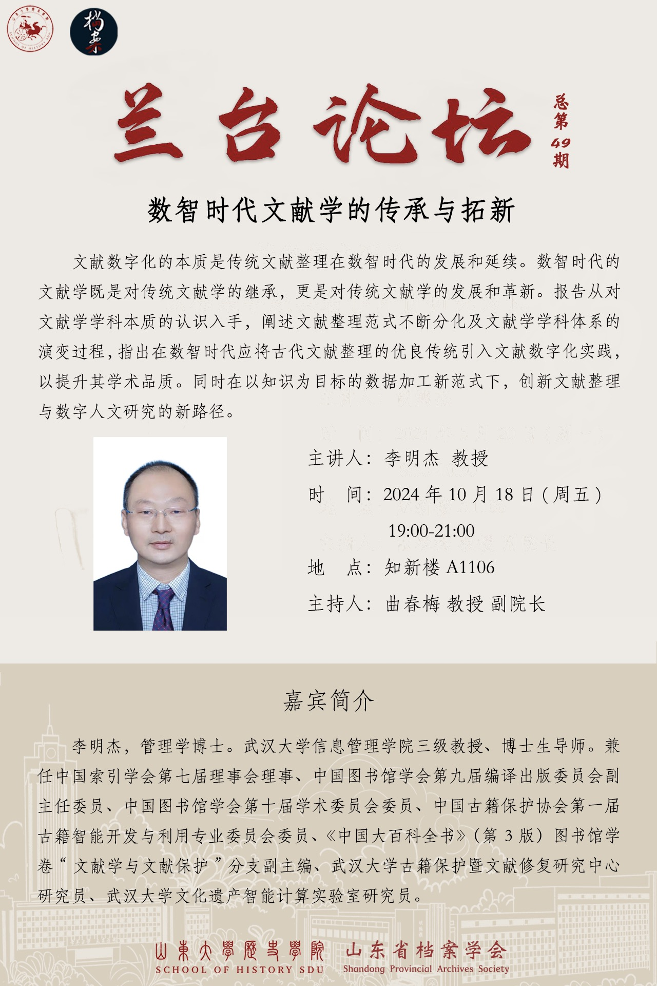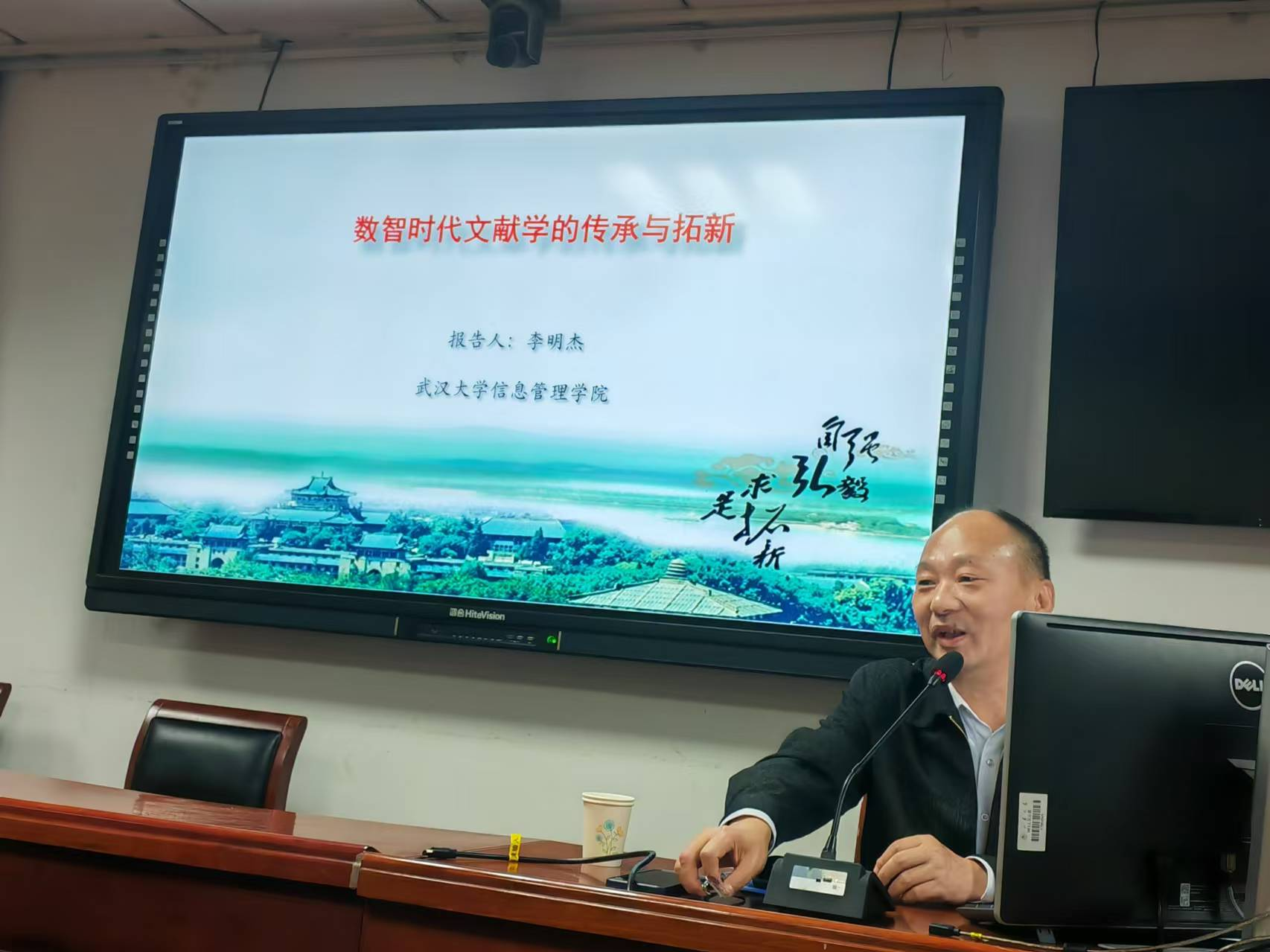 2024年10月18日晚,武汉大学信息管理公司三级教授、博士生导师、《中国大百科全书》(第3版)图书馆学卷“文献学与文献保护”分支副主编李明杰教授应邀为公司师生作主题为“数智时代文献学的传承与拓新”的学术讲座,sunbet副经理曲春梅教授主持讲座。