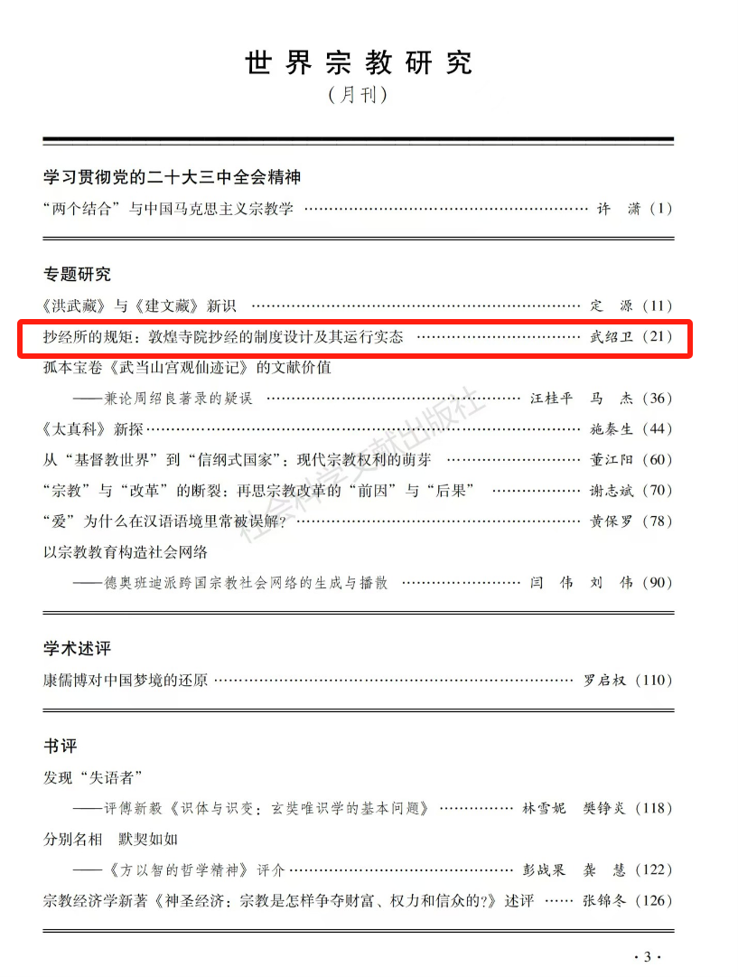 近日,公司副教授武绍卫撰写的《抄经所的规矩:敦煌寺院抄经的制度设计及其运行实态》一文在《世界宗教研究》2024年第9期正式发表。