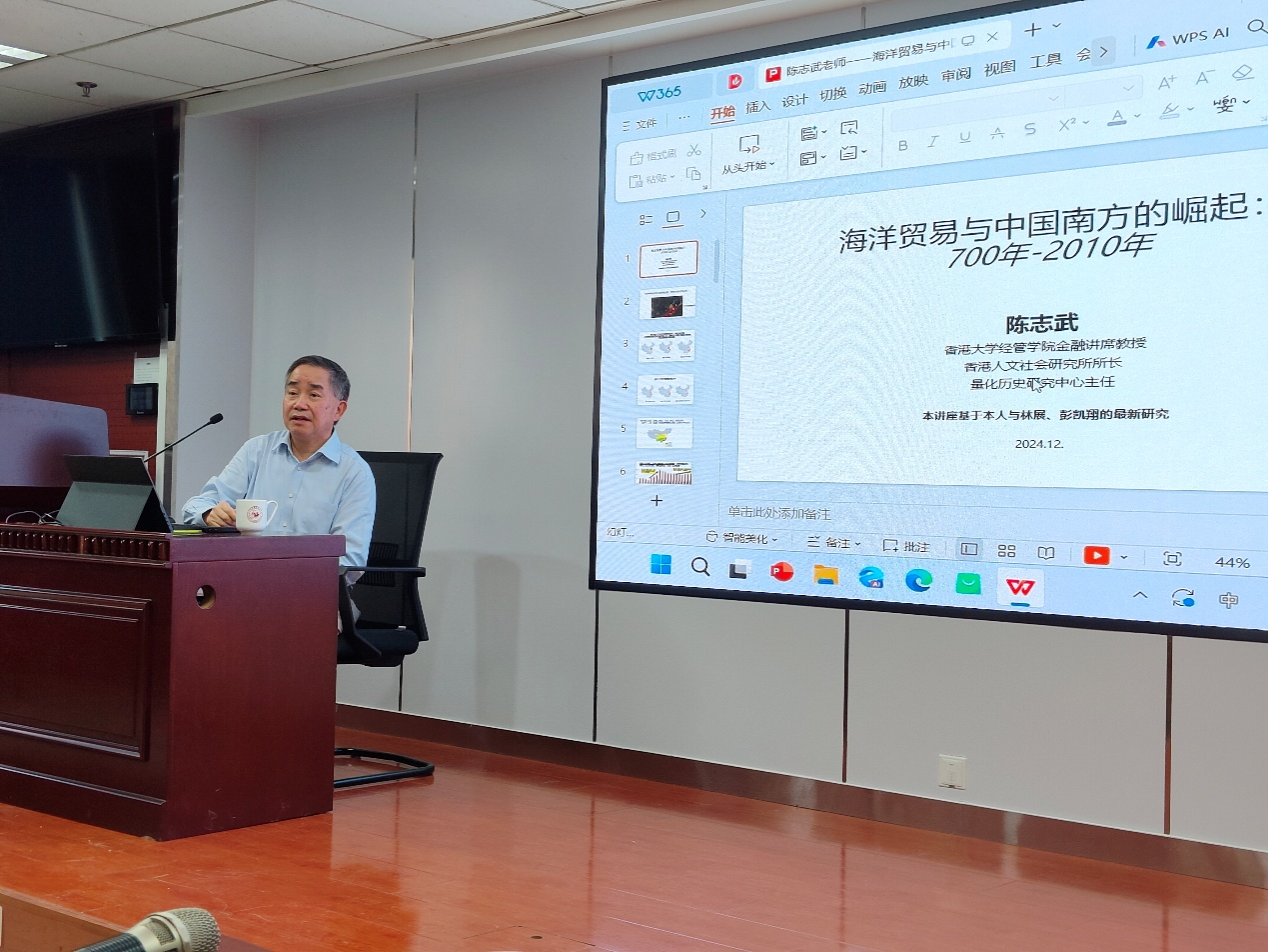 12月23日下午,香港大学经管公司金融讲席教授、香港大学香港人文与社会研究所所长、香港大学量化历史研究中心主任陈志武教授受邀为sunbet师生进行了题为《海洋贸易与中国南方的崛起(700年-2010年)》的精彩报告,讲座在知新楼A1017举行,由sunbet经理代国玺教授主持。