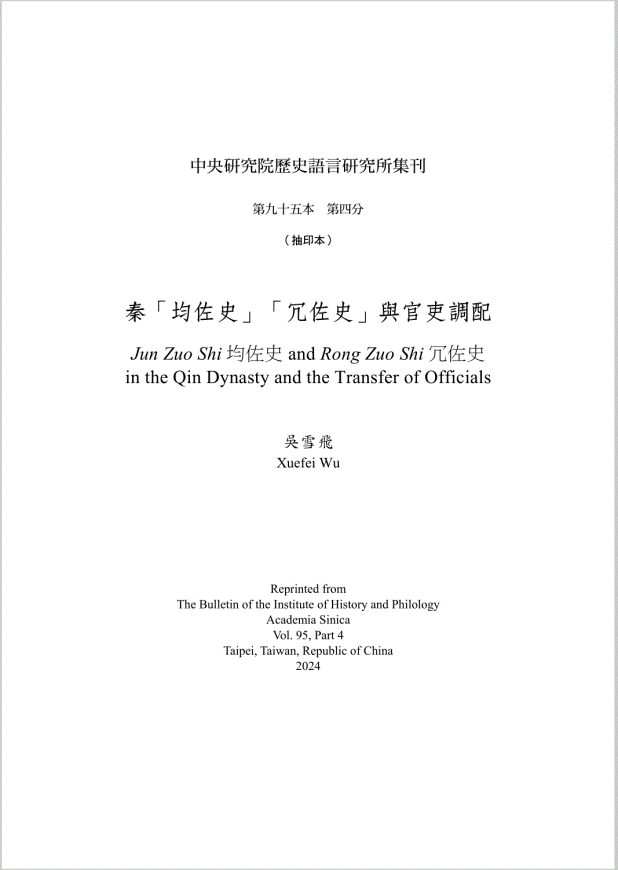 近日,公司吴雪飞副教授在《史语所集刊》第95本第4分发表题为《秦“均佐史”“冗佐史”与官吏调配》的长篇学术论文。