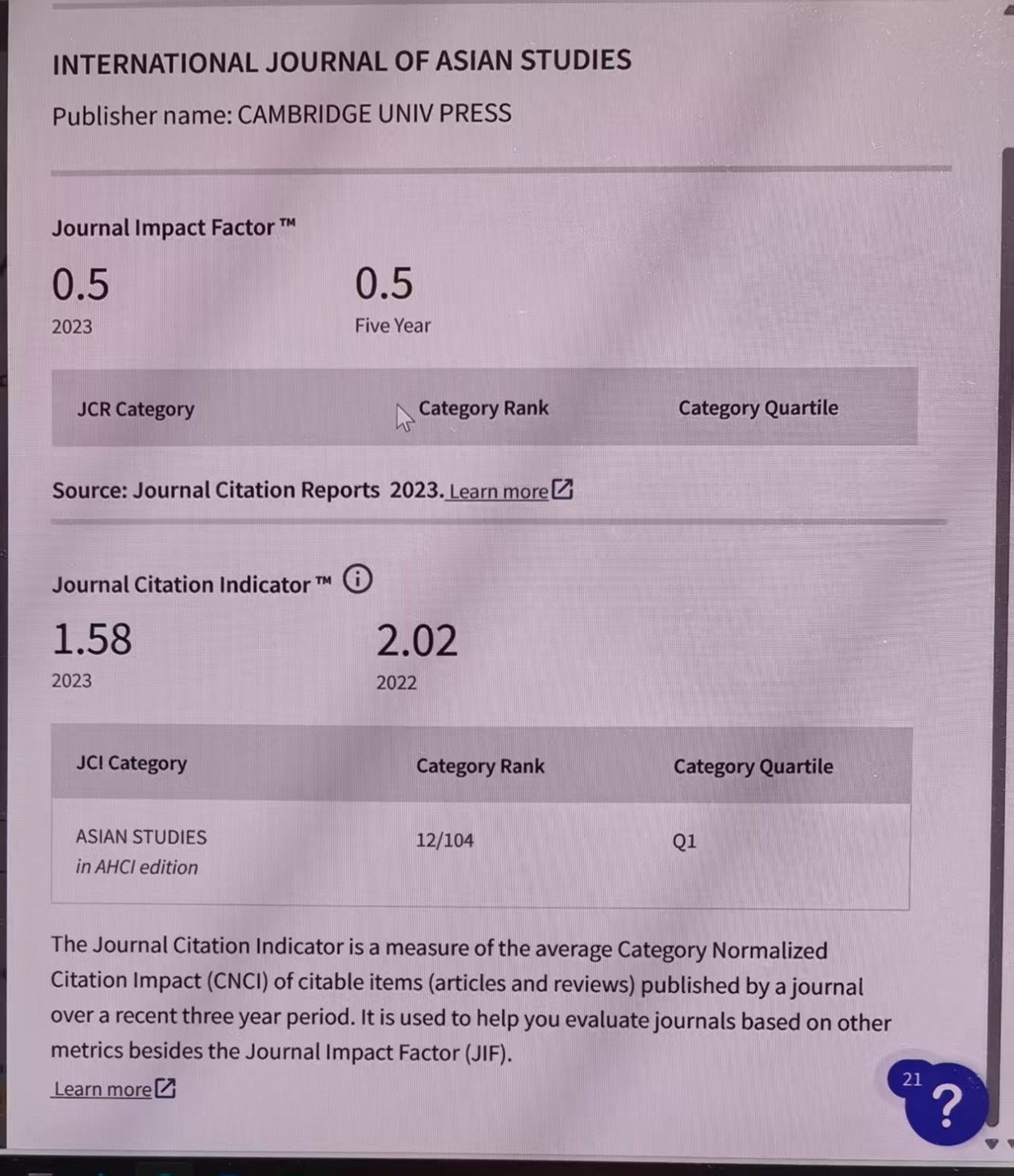 International Journal of Asian Studies是日本东京大学东洋文化研究所主办的、国际亚洲研究学界知名的学术半年刊,由剑桥大学出版社出版。该刊为A&HCI一区收录期刊,全年刊发研究性论文仅20篇上下。Web of Science 2023年亚洲研究A&HCI/ESCI期刊排名:12/104.