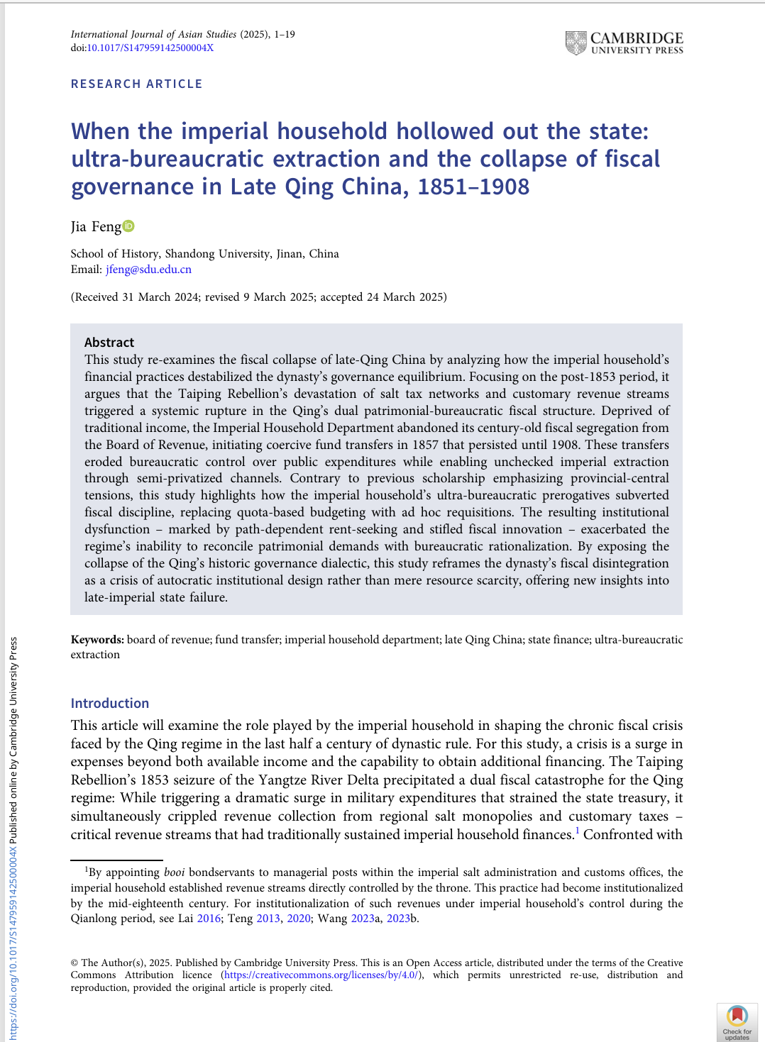 近日,sunbet副研究员冯佳独立完成的论文 “When the imperial household hollowed out the state: ultra-bureaucratic extraction and the collapse of fiscal governance in Late Qing China, 1851-1908” 于国际亚洲研究知名期刊International Journal of Asian Studies正式在线发表(doi:10.1017/S147959142500004X)。
