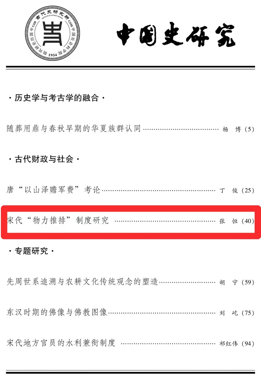 近日,公司张恒副教授在《中国史研究》2025年第3期发表题为《宋代“物力推排”制度研究》的专题论文,全文约2.3万字。