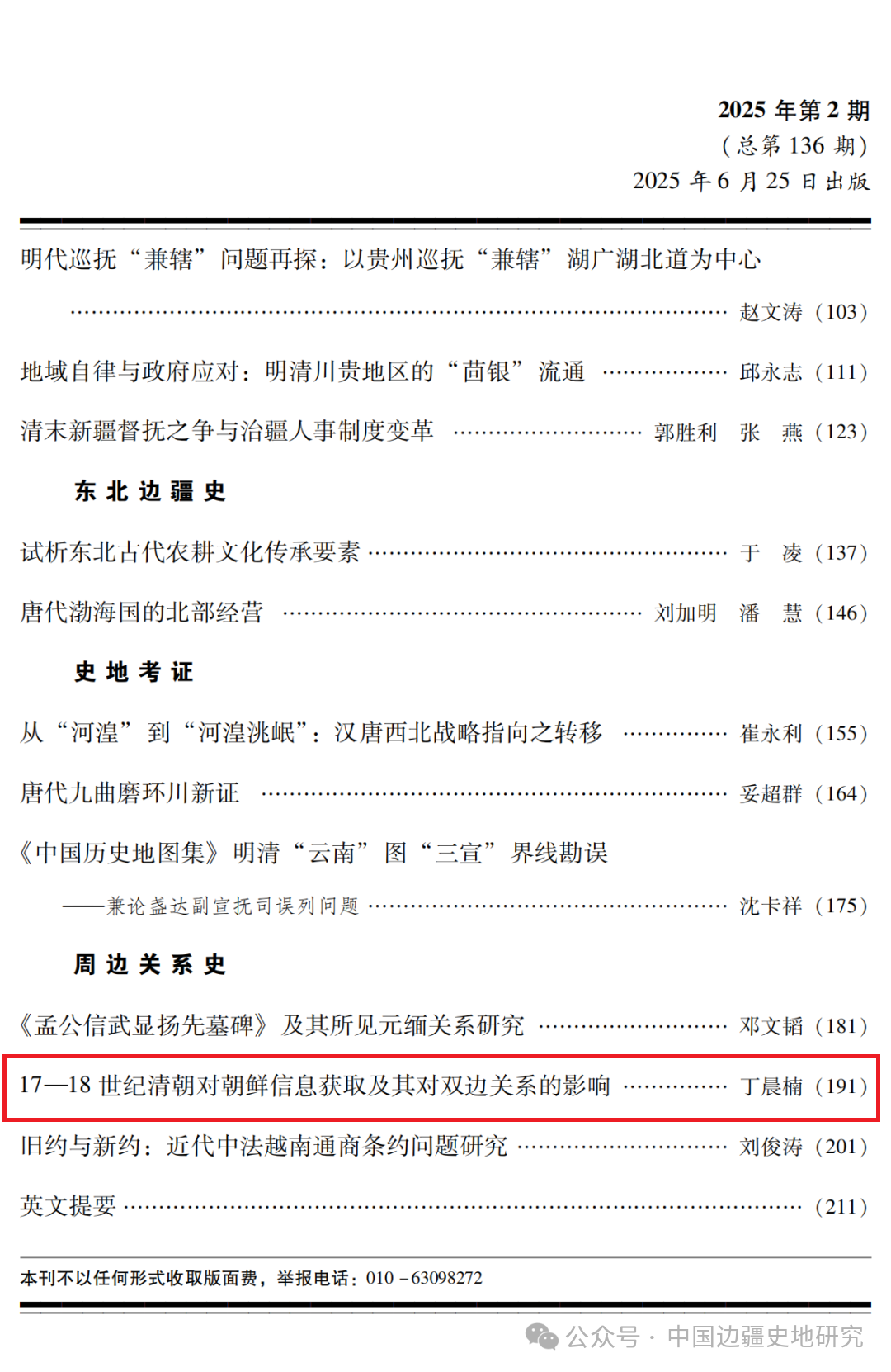 丁晨楠副教授在《中国边疆史地研究》2025年第2期上发表1.2万余字研究论文《17—18世纪清朝对朝鲜信息获取及其对双边关系的影响》。