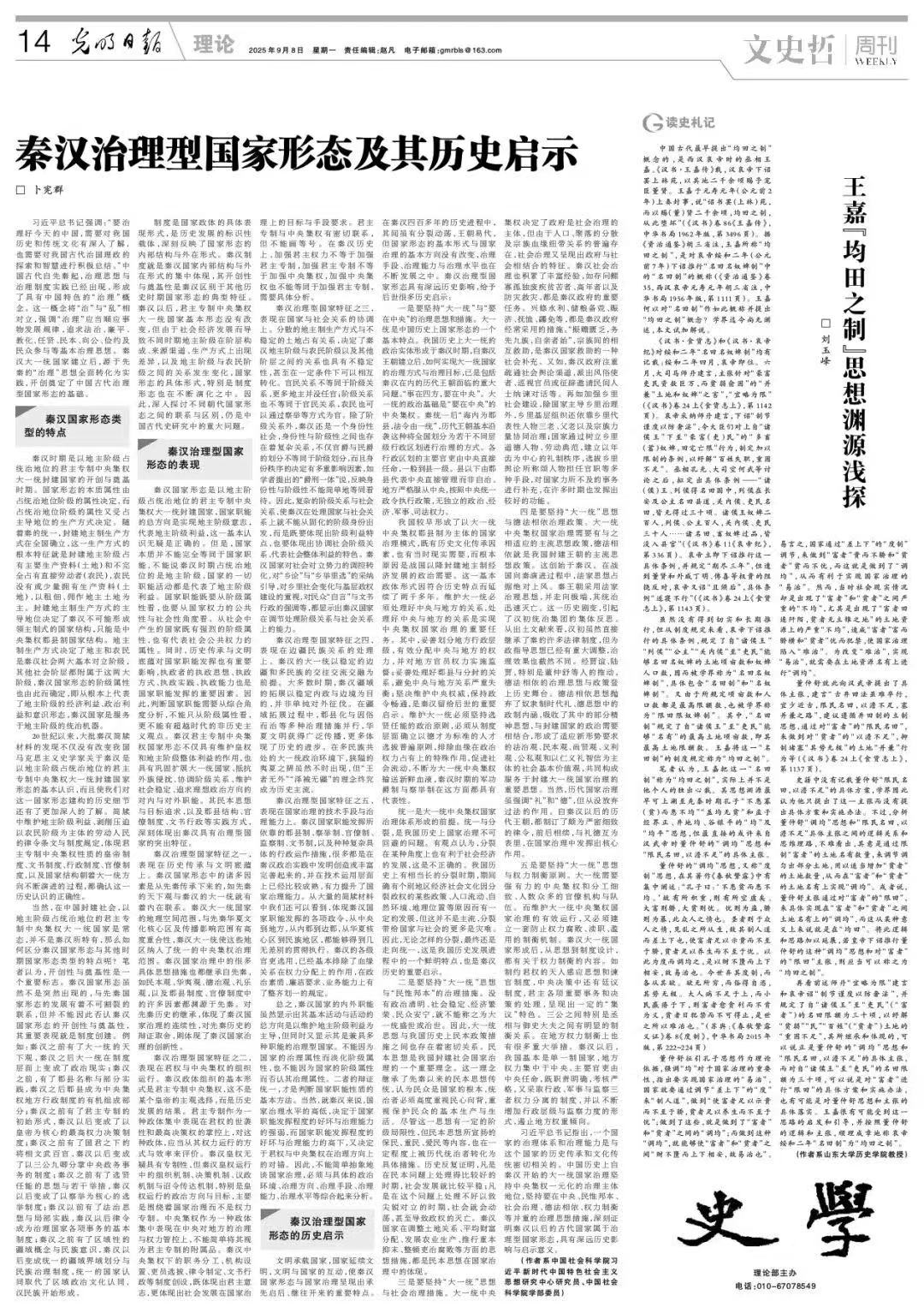 公司刘玉峰教授在《光明日报》2025年9月8日第14版“文史哲周刊·理论·史学”,发表《王嘉“均田之制”思想渊源浅探》,对上述问题做了分析解说。论文认为,王嘉把哀帝下诏推行的“名田制”称为“均田之制”,实际上并不是他个人的独出心裁。其思想渊源最早可上溯至先秦时期孔子“不患寡(贫)而患不均”“盖均无贫”和孟子经界正、井地均、谷禄平的“均”及“均平”思想,但最直接的很有可能来自汉武帝时董仲舒的“调均”思想和“限民名田,以澹不足”的具体主张。