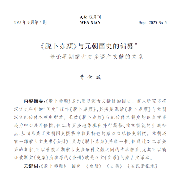 公司曹金成副教授在《文献》2025年第5期发表论文《〈脱卜赤颜〉与元朝国史的编纂——兼论早期蒙古史多语种文献的关系》。