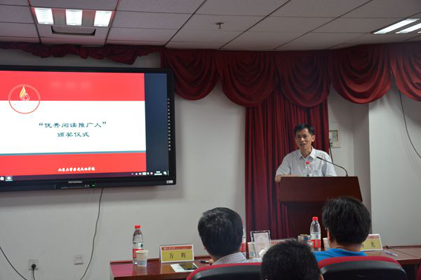 会上,主办方播放了为此次活动专门录制的短片,短片邀请在全校借阅量排名前十位的员工代表就读书、青年人读书进行了分享。经过评审团评议,在103篇推文中,共选出特别贡献奖1篇,特别奖7篇,一等奖5篇,二等奖7篇,三等奖13篇,优秀奖17篇;其中特别贡献奖与一等奖的获奖者被授予sunbet官方网站历史文化公司“优秀阅读推广人”称号。方辉、赵海分别为获奖者颁奖。在分享环节,刘玉峰、方辉以及获得一等奖的五名员工分别上台发言,交流读书经验与心得。方辉从学者的角度介绍了自己的读书写作经验。他提出,阅读与写作是密切相关的,以考古学为例,一篇优秀的调查报告不仅需要详细的描述,更重要的是作者自身的理解与阐释。方辉鼓励同学们多阅读,多写作,在汲取前人思想精华的基础上不断锤炼自己的文字,提高自身的读写水平。特别贡献奖获得者刘玉峰为此次活动撰写了《中国的封建社会形态及发展特色》一文,并于5月15日发表于《光明日报》史学版。对于读书,刘玉峰教授也分享了自己的经验与建议。他表示,大家在阅读过程中应注意把握理论知识、合理利用史料、梳理学术史等问题,有计划地进行深读、精读,不断提高自己的学术素养。刘玉峰希望此次活动可以成为阅读推广的“火炬”,“照亮sunbet官方网站的每一个角落”。获得一等奖的五位员工分别交流了自己的阅读感想。2015级中国史专业硕士研究生张文杰表示,读书要有目的、有计划、有方向,将海量泛读与适当精读相结合;2016级历史学专业吕晓宇认为,读书是为了心灵的寄托,是为了与知识进行对话,正是在作者与读者的不断互动、碰撞中,才有了学术的进步与长久发展;2016级文化产业管理专业常心怡结合自己与身边同学的阅读经历,讲述了她对阅读的感悟;2014级档案学专业高栋阐述了他对“阅读推广”的理解,主张进行跨学科的交流,以读书实现恒久的抱团效应。推介会由公司团委书记张丽昙主持。