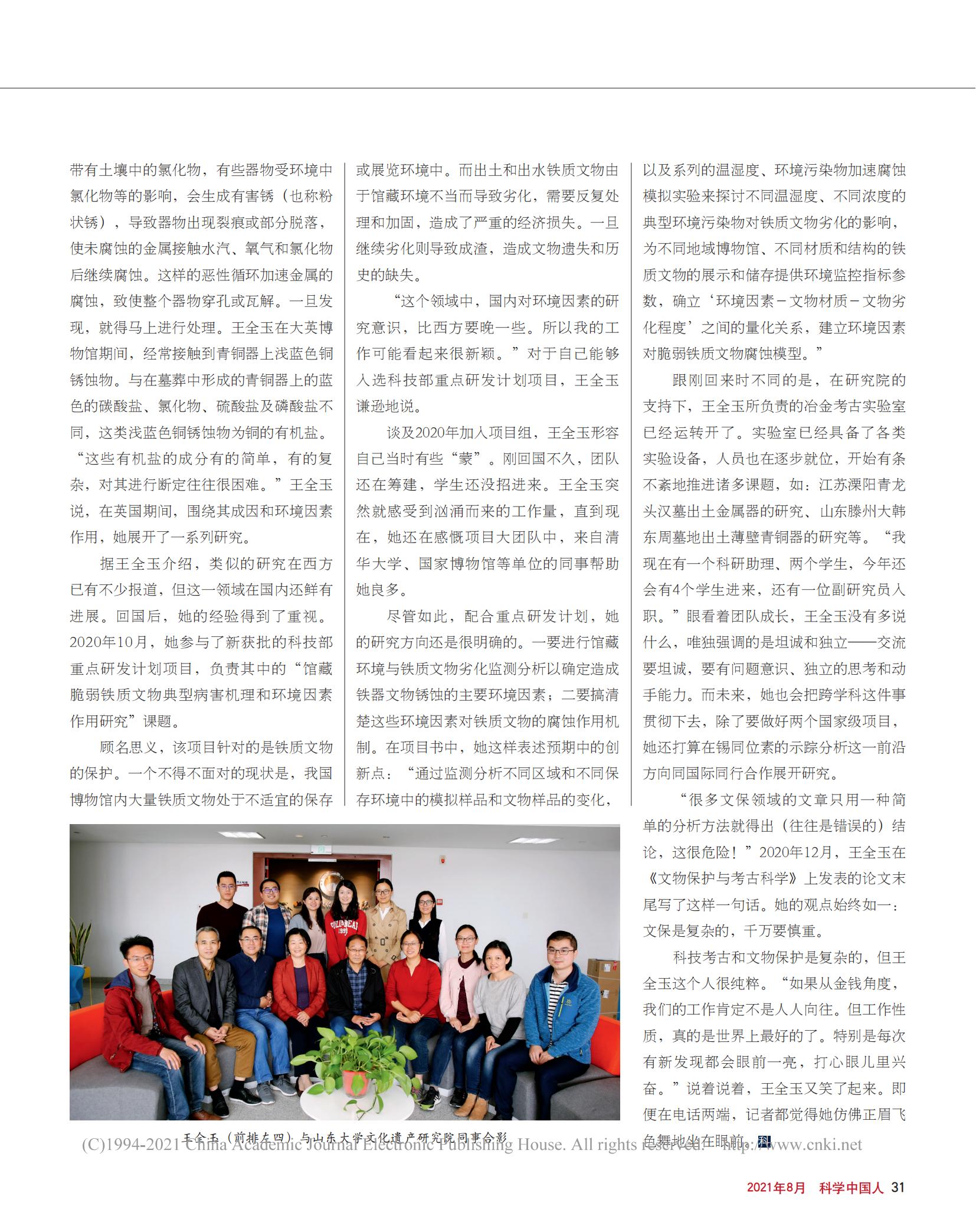 据王全玉介绍,类似的研究在西方已有不少报道,但这一领域在国内还鲜有进展。回国后,她的经验得到了重视。2020年10月,她参与了新获批的科技部重点研发计划项目,负责其中的“馆藏脆弱铁质文物典型病害机理和环境因素作用研究”课题。
