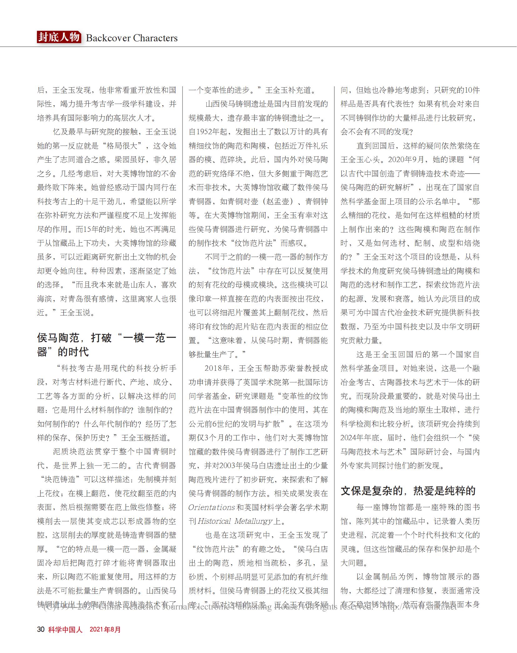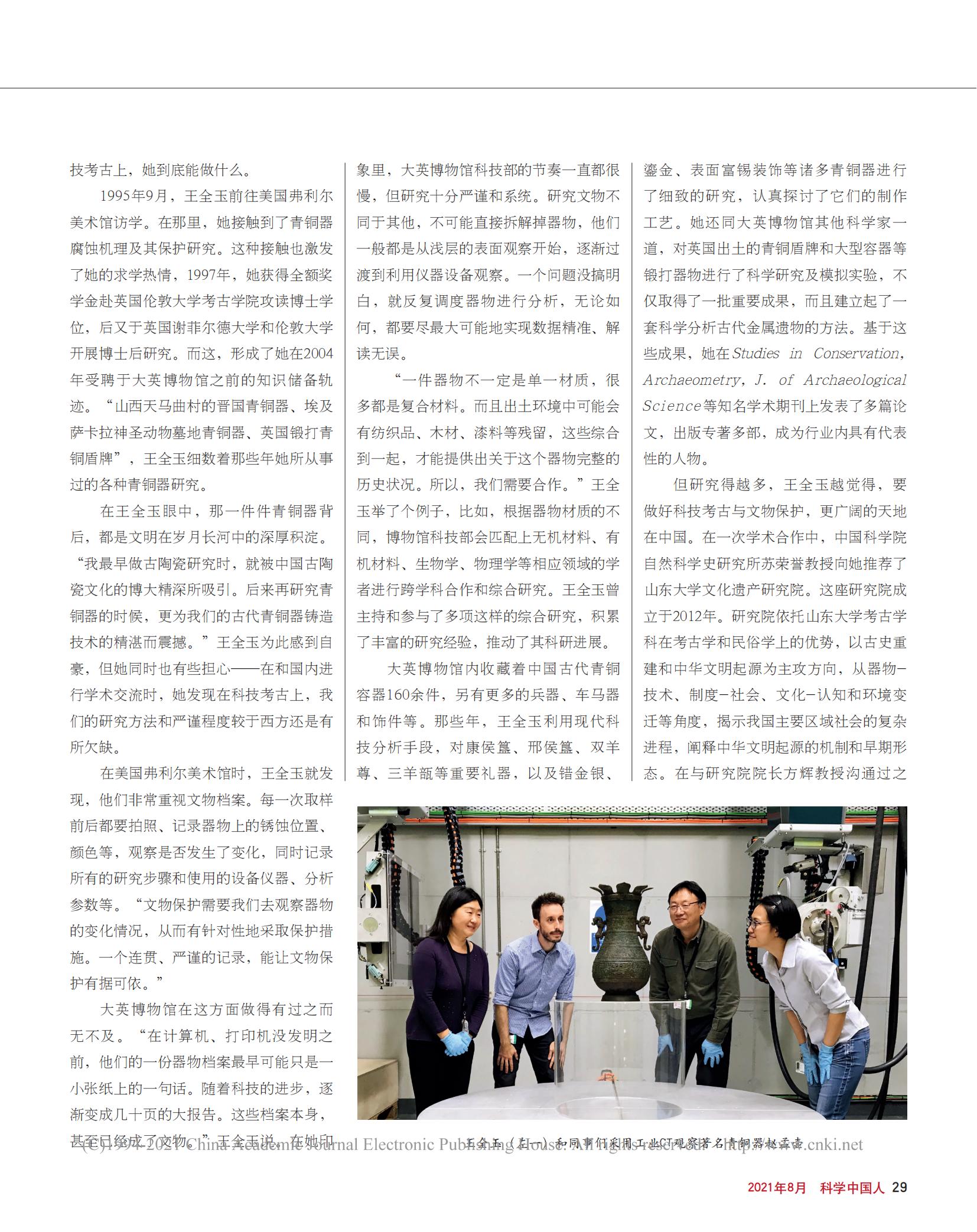 “很多文保领域的文章只用一种简单的分析方法就得出(往往是错误的)结论,这很危险!”2020年12月,王全玉在《文物保护与考古科学》上发表的论文末尾写了这样一句话。她的观点始终如一:文保是复杂的,千万要慎重。科技考古和文物保护是复杂的,但王全玉这个人很纯粹。“如果从金钱角度,我们的工作肯定不是人人向往。但工作性质,真的是世界上最好的了。特别是每次有新发现都会眼前一亮,打心眼儿里兴奋。”说着说着,王全玉又笑了起来。即便在电话两端,记者都觉得她仿佛正眉飞色舞地坐在眼前。
