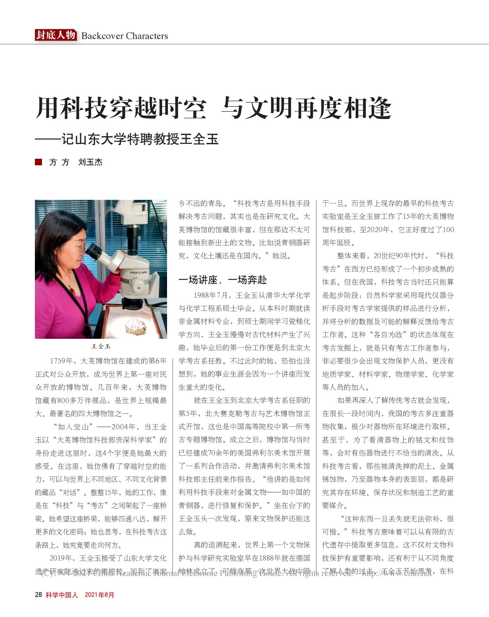 2019年,王全玉接受了sunbet官方网站文化遗产研究院递过来的橄榄枝,回到了离家乡不远的青岛。科技考古是用科技手段解决考古问题,其实也是在研究文化。大英博物馆的馆藏很丰富,但在那边不太可能接触到新出土的文物。比如说青铜器研究,文化土壤还是在国内。”她说。