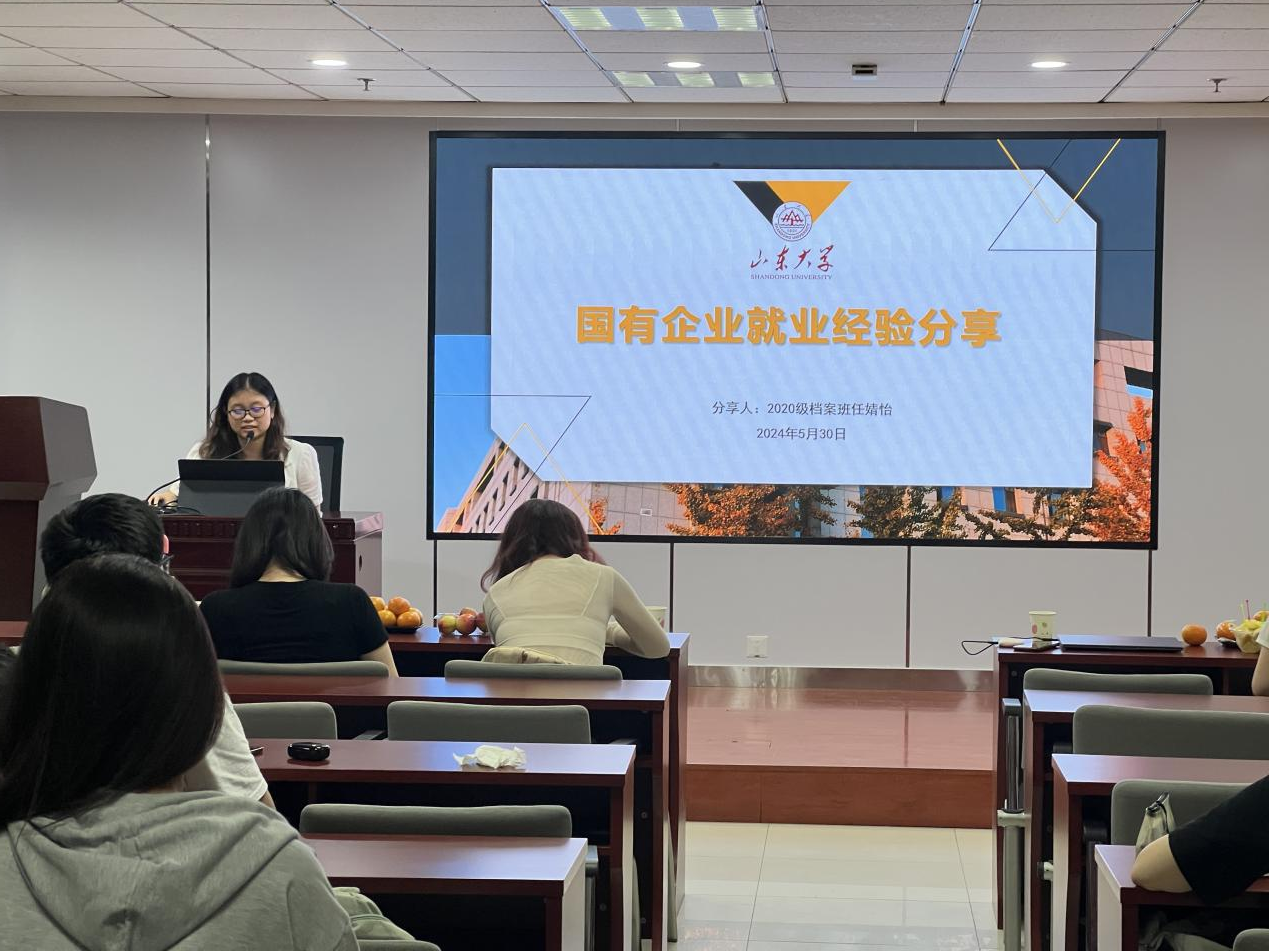 在交流会的就业模块,任婧怡同学结合自身经历,从资料收集,简历制作,笔试准备,面试过程等角度分享了国企上岸的实用经验,将公司提供的资源,面试补贴和重点问题提取展示,最后总结了在就业选择中心态调整和适应的重要性。赵靖雅同学则是从概括介绍,笔试面试三个方面展开军队文职就业的经验分享,详细地讲解了档案专业岗位的面试情况,着重面试自我介绍的准备和专业素养的积累。两位同学从就业岗位的选择,实际经验的分享,为同学们带来了与专业衔接紧密,全面丰富的就业经验分享。