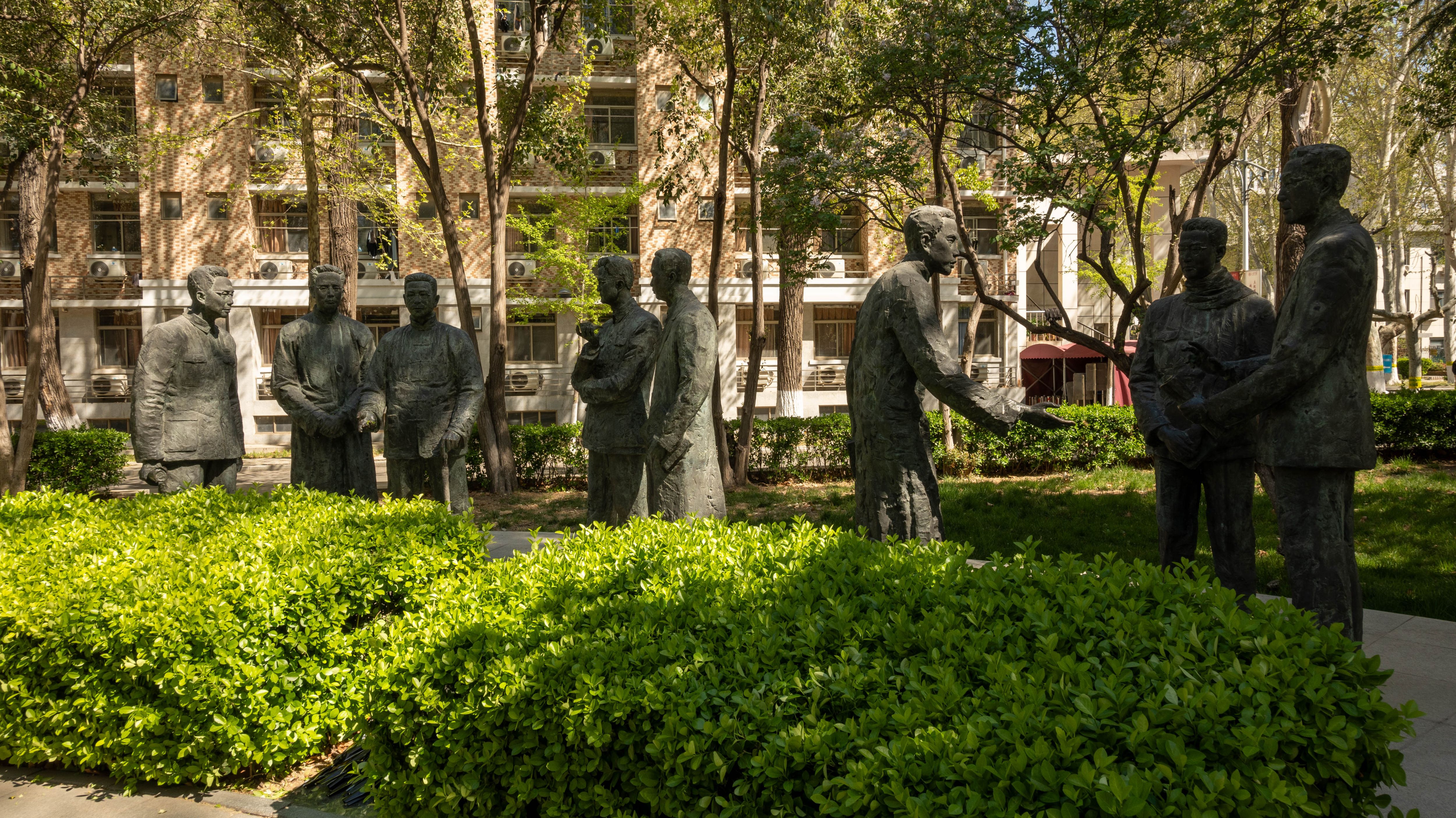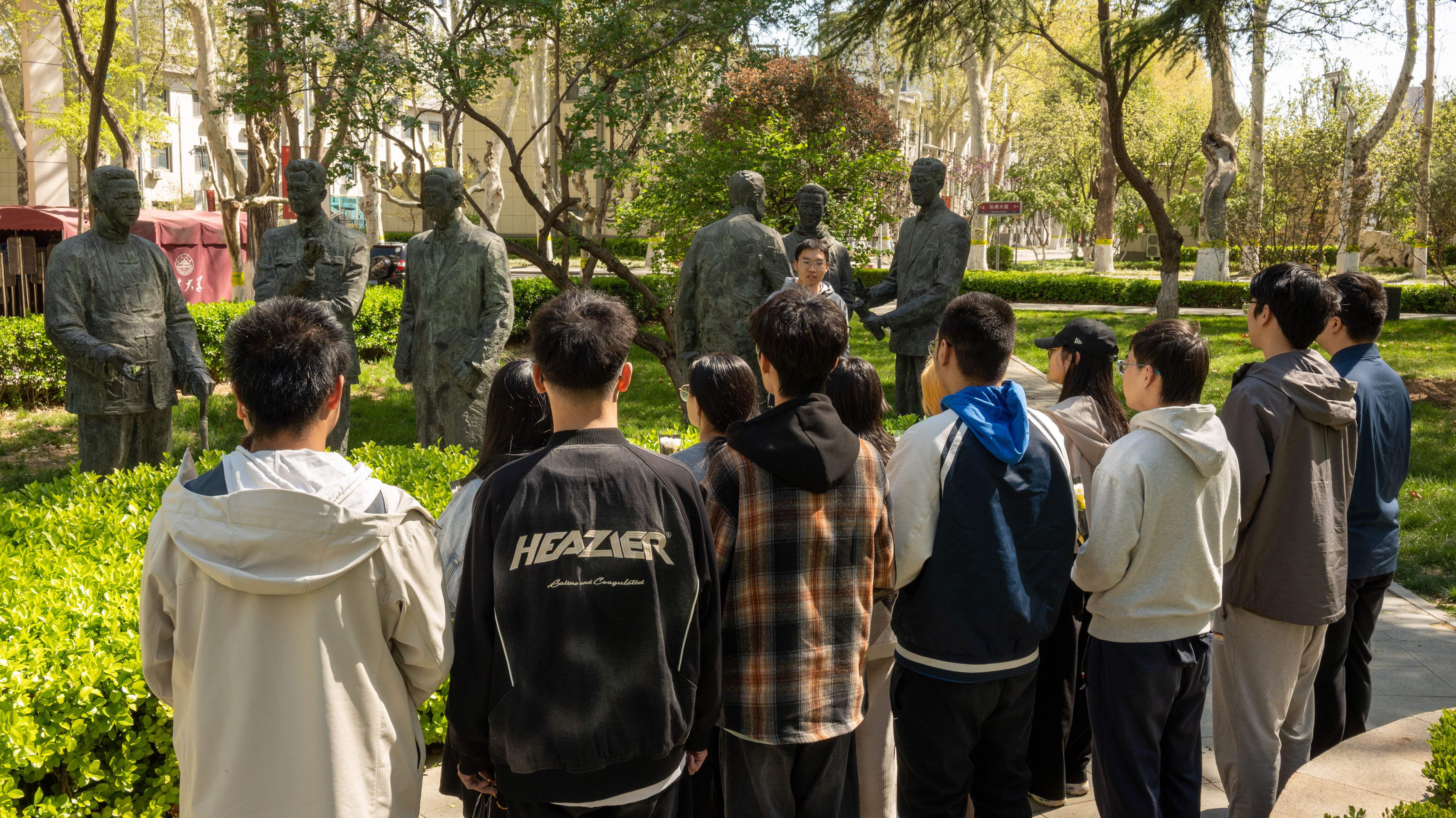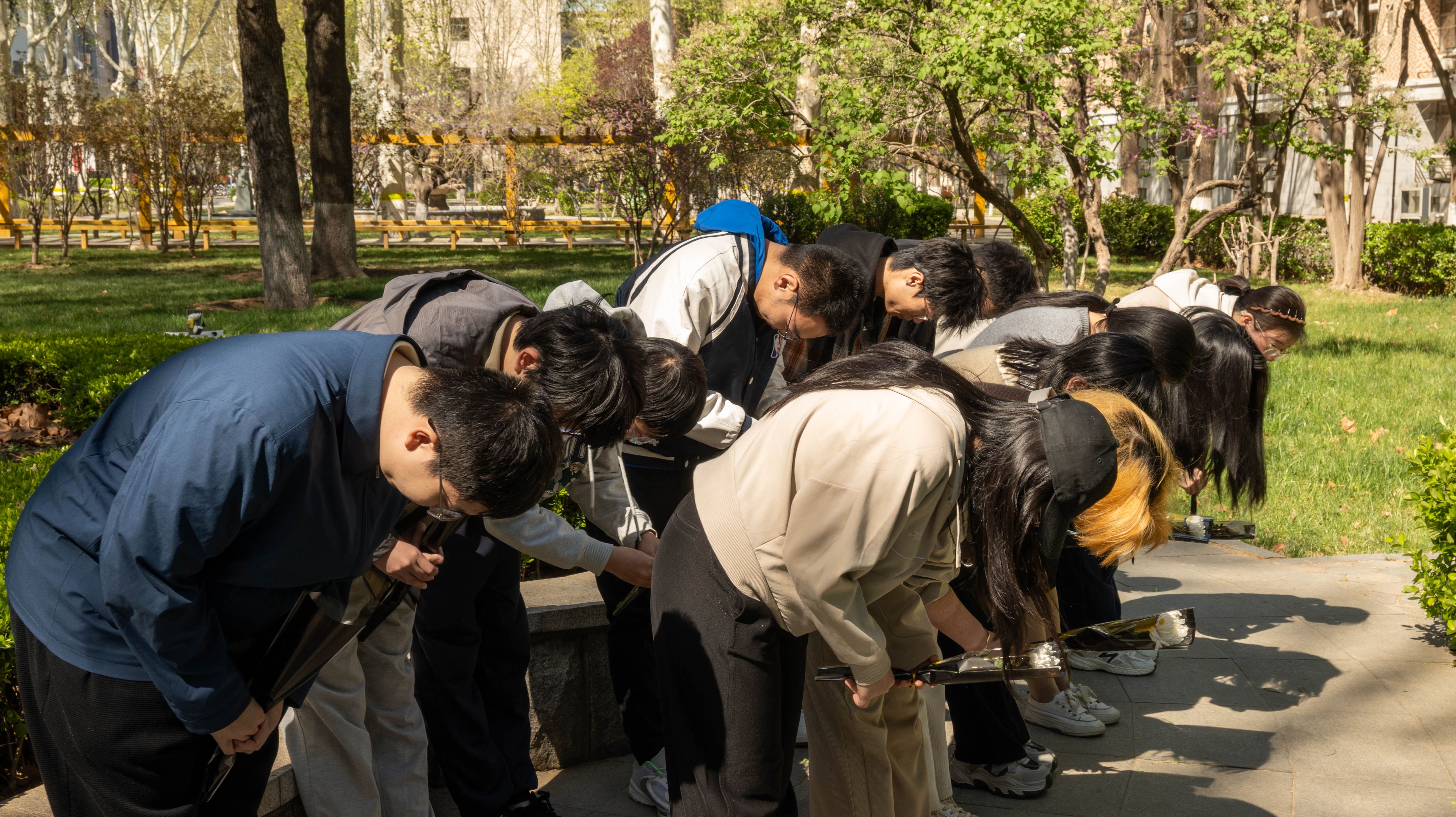 缅怀先贤,重温历史荣光。上午10时,员工们齐聚“八马同槽”雕像前,手持菊花,庄严肃立。活动伊始,员工们细致清扫了雕塑及周边环境,拂去尘埃,以洁净之姿致敬先辈。随后,2023级本科生代表尹加军带领同学们回顾了“八马同槽”八位史学泰斗的学术成就与人格风范。