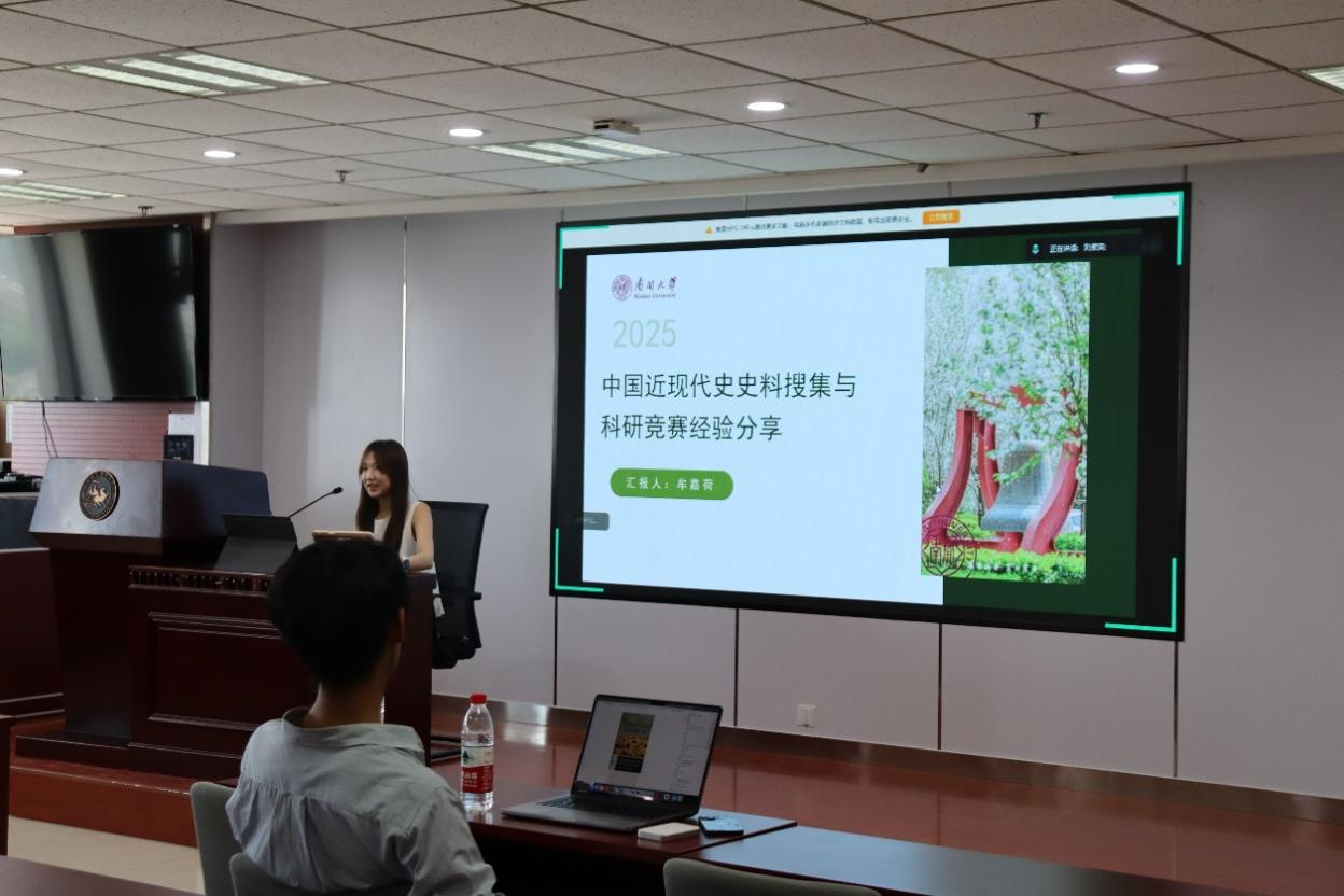 南开大学牟嘉荷同学以“中国近现代史史料搜集与科研竞赛经验分享”为主题,从研究方向的确定、如何获取史料、本科期间的竞赛以及其他建议四个方面展开介绍。她鼓励本科生“打破对自己的限制,在多元尝试中锚定兴趣”,详细介绍了档案馆查档技巧、数据库检索方法及口述史竞赛经验,提供了宝贵的近代史史料检索经验。最后也强调本科生需要找到合适的放松方式,保持身心健康很重要。