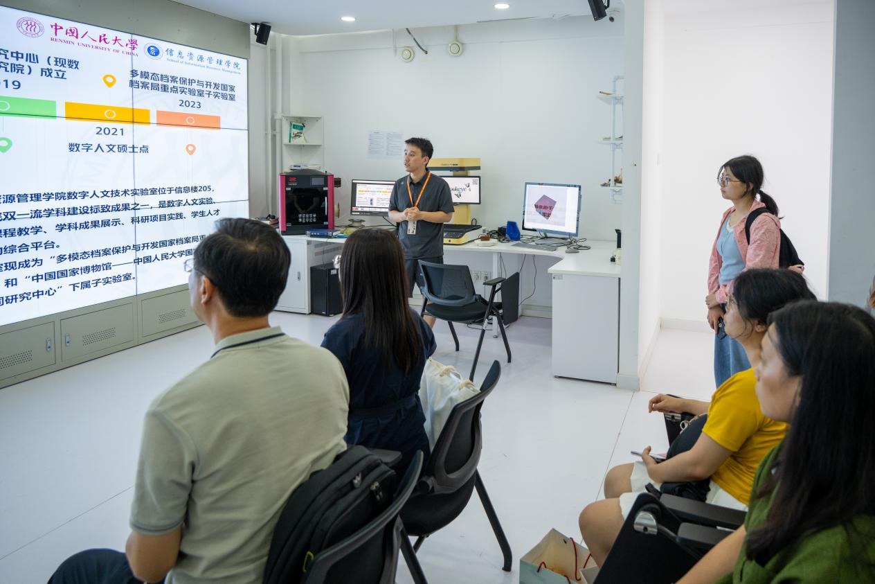 8月26日下午,师生们来到中国人民大学信息资源管理公司参观学习。公司档案系系主任、电子文件管理研究中心执行主任钱毅教授对师生们的到来表示欢迎,并为师生们作主题为“基于五态四化的信息资源形态演进”的学术讲座。钱老师从档案资源的形态演变切入,简明生动地介绍了技术环境变迁下档案资源态别、管理空间、适用方法等要素的嬗变,为新时代发挥档案资源在证据留存、记忆建构、知识服务等多场景的利用价值提供了新的理论视角。在公司数字人文技术实验室刘力超老师的带领下,师生参观了实验室并了解相关历史沿革、技术设施、人才培养情况和最新科研成果,感悟数字人文技术赋能历史文化资源挖掘的现实魅力。