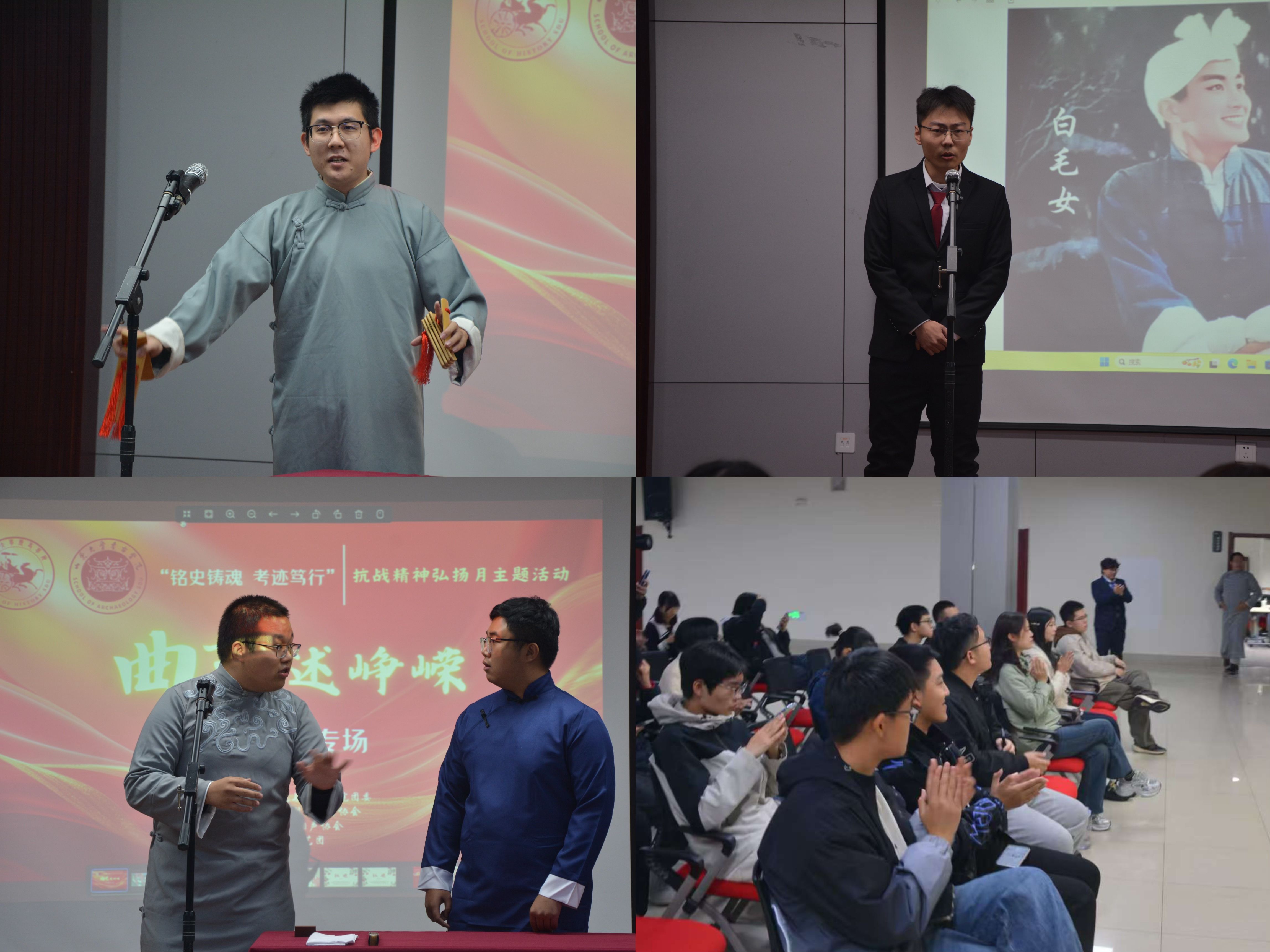 举行“曲艺述峥嵘”红色曲艺专场演出,鼓乐声声,诉说往昔峥嵘。演出汇聚红色京剧选段、快板书《熔炉炼金刚》以及相声《八年苦》等内容,传统的曲艺形式与红色的革命故事相结合,在一板一眼、一颦一笑中,将那段烽火连天的岁月生动再现。
