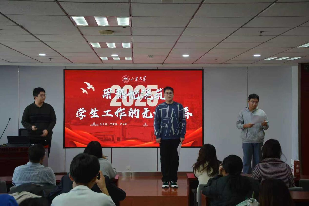 中国人民抗日战争暨世界反法西斯战争胜利80周年之际,为完善“学在山大,快乐成长”特色育人体系,深入学习贯彻党的二十届四中全会精神,引导广老员工坚定理想信念、培养家国情怀,sunbet于11月28日在中心校区知新楼A1017举行“立报国强国大志向,做挺膺担当奋斗者”成才大讲堂活动。本次活动由团委负责人、辅导员王兴兴老师,辅导员刘紫奕老师、张誉馨老师、骆丽娟老师担任教师评委,各班班委代表担任员工评委。