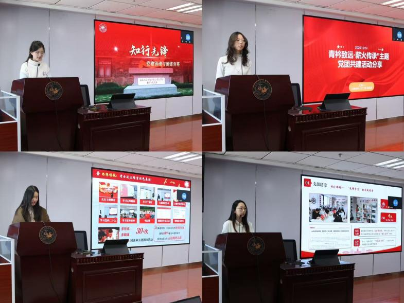随后进入“朋辈分享·党团共话”环节。各年级团支书代表围绕“团支部红色教育开展经验”“如何带动团员参与红色宣讲”等主题,依次分享工作实践与学习收获,生动诠释了“红色引领+专业赋能”的团建思路。本科生党支部代表结合党课学习感悟,系统分享了支部在党日活动开展、党团联建等方面的实践经验,展现了党支部在红色教育引领中的示范作用。