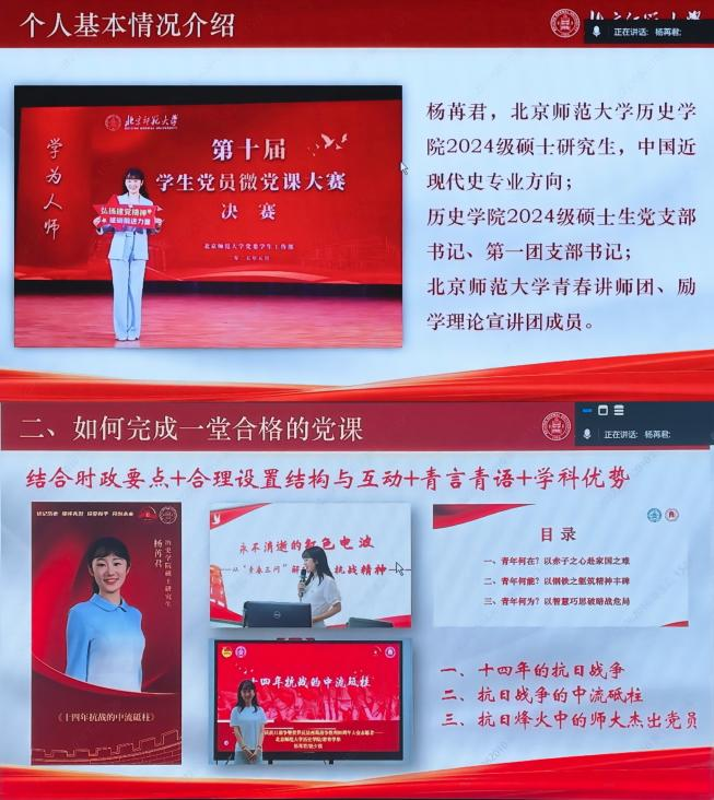 在精品党课学习环节,北师大“青春讲师团”杨苒君讲师讲解微党课《日记里的伟大建党精神》,并分享红色宣讲实践心得。她围绕微党课制作、合格党课打造及党课与主题党日活动融合等核心内容倾囊相授,以其打造的党课《十四年抗战的中流砥柱》《永不消逝的红色电波》,“宣讲+红色剧本杀”创新主题党日活动为实践案例,为红色教育创新提供了鲜活范例。