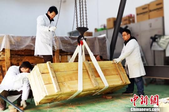 图为考古专用龙门吊车翻转装有遗址墓葬的木箱,以便检查墓葬背面情况。
