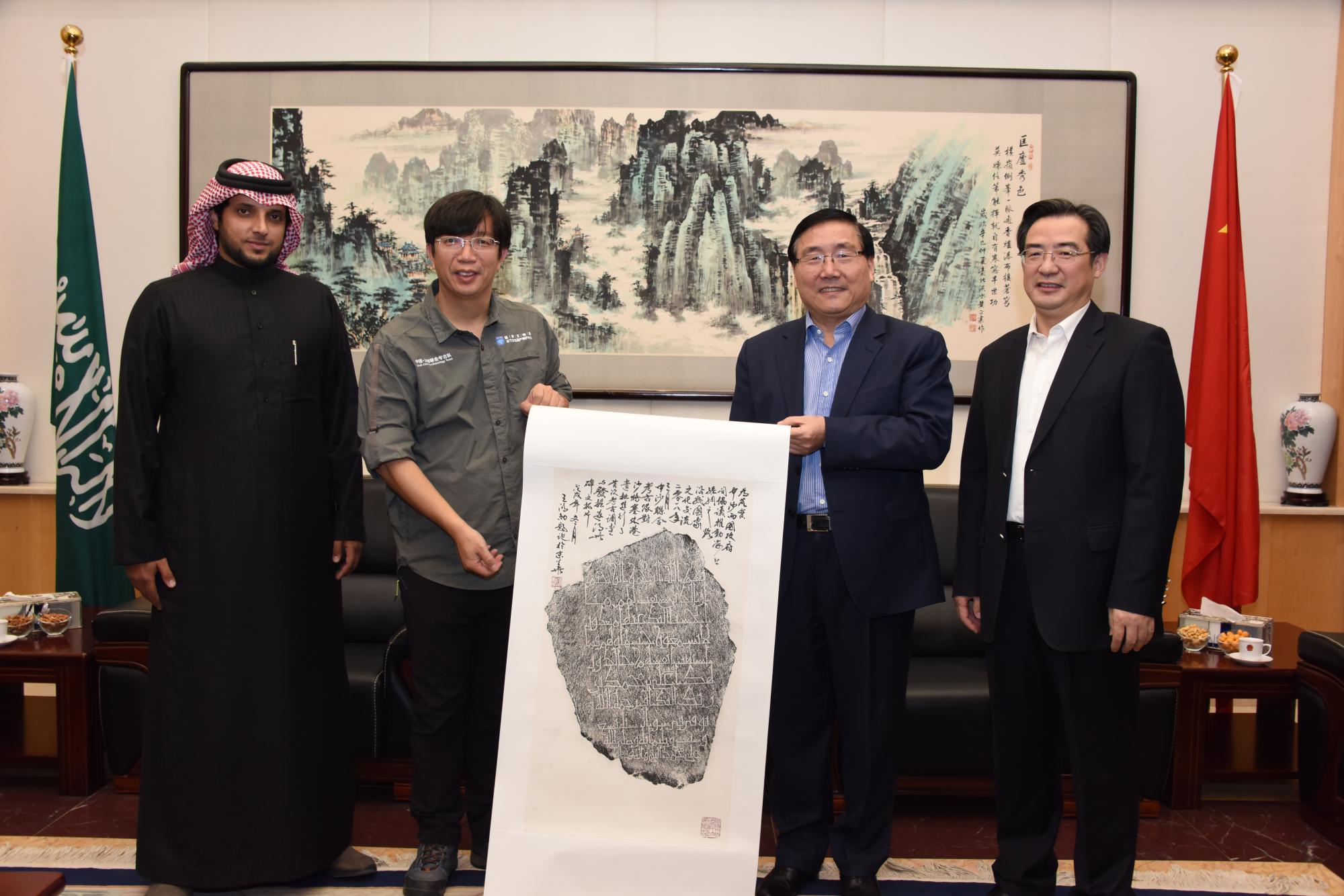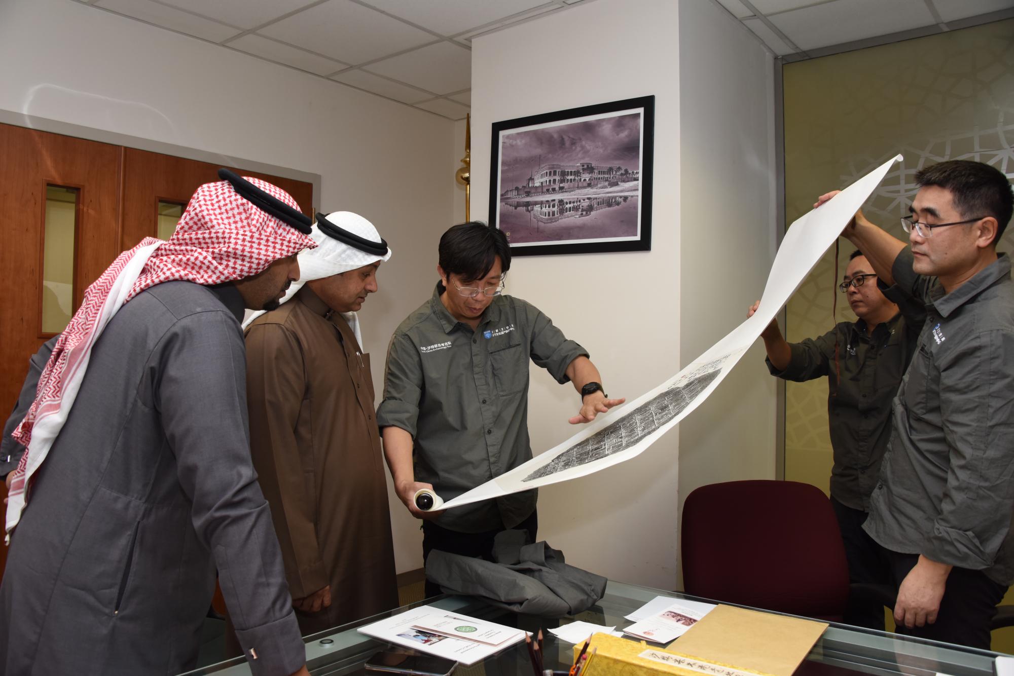 沙特考古局长接见中国考古队员并察看碑文拓片 中沙联合考古队提供