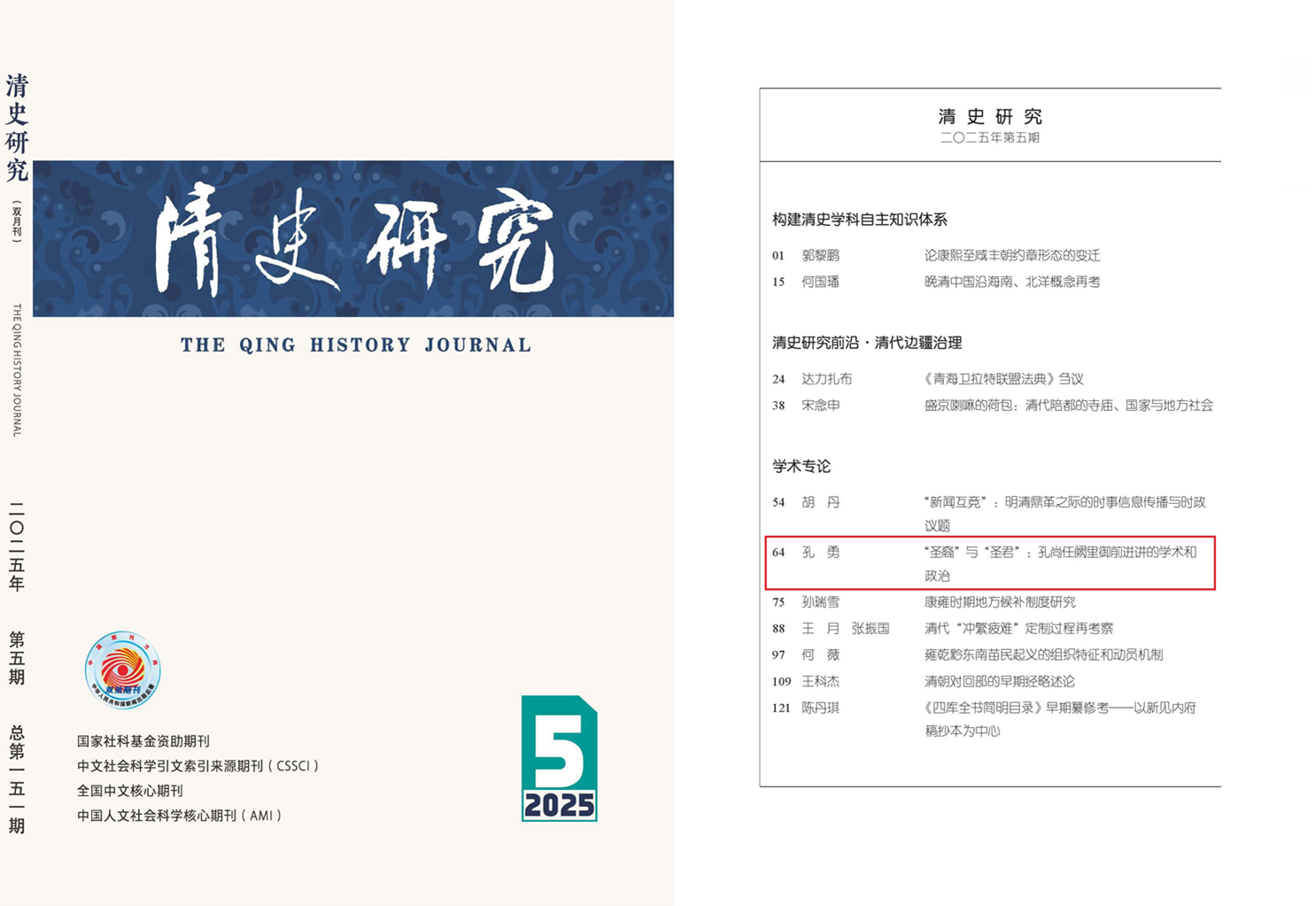 近日,公司孔勇副教授在《清史研究》2025年第5期发表约1.3万字论文《“圣裔”与“圣君”:孔尚任阙里御前进讲的学术和政治》。论文立足清代起居注、实录、时人笔记和孔尚任撰《出山异数记》、孔毓圻等撰《幸鲁盛典》等常见史料,重新考索了康熙二十三年(1684)孔尚任在阙里(曲阜)孔庙为康熙帝进讲儒家经典的相关史实及其意义。文章认为,康熙帝在首次南巡返程途中临时安排孔尚任等“圣裔”进讲《大学》和《易经》相关章节,...