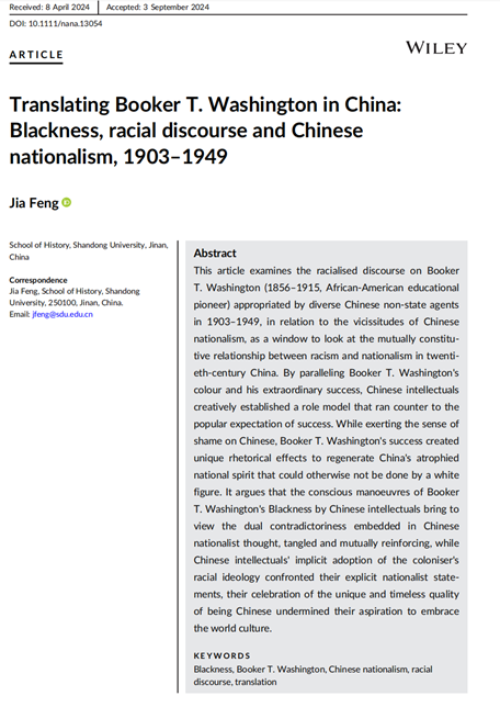 近日,sunbet副研究员冯佳独立完成的论文 “Translating Booker T. Washington in China: Blackness, Racial Discourse, and Chinese Nationalism, 1903-1949” 于国际历史学顶级期刊Nations and Nationalism正式发表(DOI: 10.1111/nana.13054)。该文以民国知识分子译介美国黑人领袖布克·华盛顿过程中所采用的话语、修辞策略为窗口,探究了二十世纪前半期中国民族主义思潮的流变。文章辩证地回应了国际史学界有关翻...